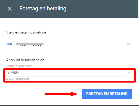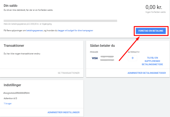 Efter indbetalingen er gået i gennem, så har du nu oprettet en ny Google Ads konto med et tilknyttet betalingskort.
