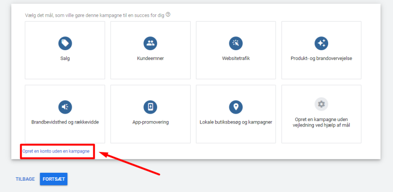 Tryk på Opret en konto uden en kampagne, som vist nedenfor