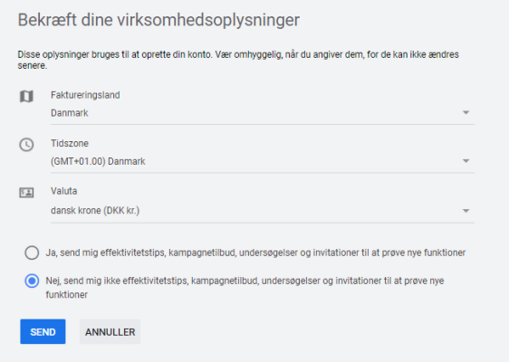 Tjek at faktureringsland, tidszone og valuta står korrekt og tryk derefter Send