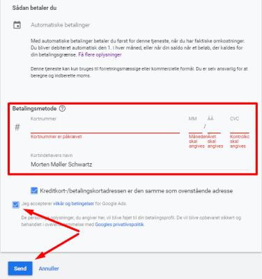 Scroll derefter ned og udfyld betalingsmetode, som vist nedenfor.