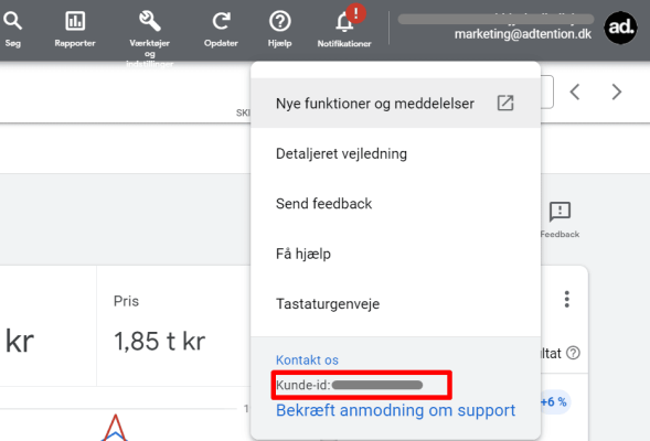 Kopier dit kunde-ID jf. nedenstående billede og send det pr. mail til din kontaktperson hos Adtention.