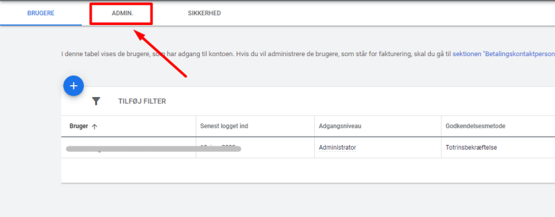 Inde i Adgang og sikkerhed skal du trykke på Admin oppe i venstre hjørne, som vist nedenfor.