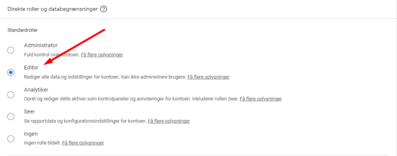 Vælg derefter de ønskede tilladelser. Som minimum skal vi have Editor rettigheder, som set herunder: