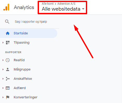 Nu vælger du den konto som du ønsker vi skal have adgang til i øverste venstre hjørne, som set herunder: