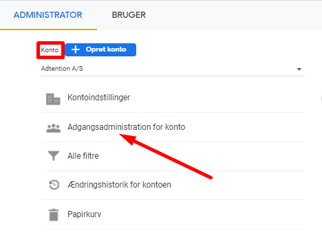 Her ser du oversigten over hvilke konti der har adgang til din Google Analytics.