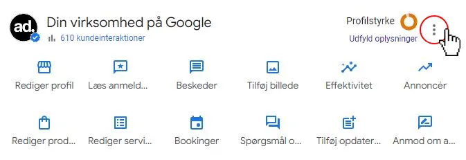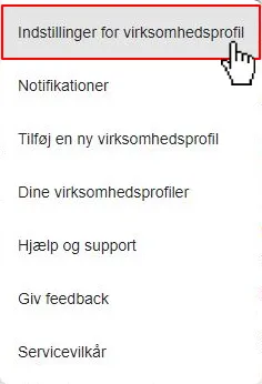 Nu vil der komme en menu frem. Her skal du trykke på “Indstillinger for virksomhedsprofil”.