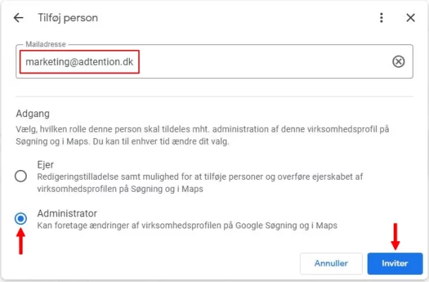 Nu skal du indtaste vores mailadresse “marketing@adtention.adtention.dev” og sætte vores rolle til “Administrator”. Herefter trykker du på “Inviter”.
