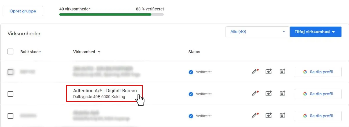 Når du er logget ind, skal du klikke på din virksomhedsprofil, som vist herunder: