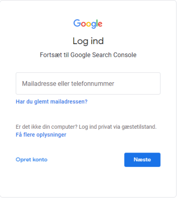 Hvis du ikke er logget ind på Google Search Console i forvejen vil du se nedenstående resultat.
