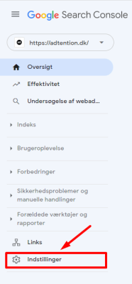 For at kunne give adgang til en ny bruger til din Google Search Console skal du nu trykke på “Indstillinger” eller “Settings”, hvis din Google Search Console er på engelsk.
