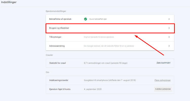 Her kan du se, hvem der har det bekræftede ejerskab samt hvilke brugere der har tilladelse til at se din Google Search Console.