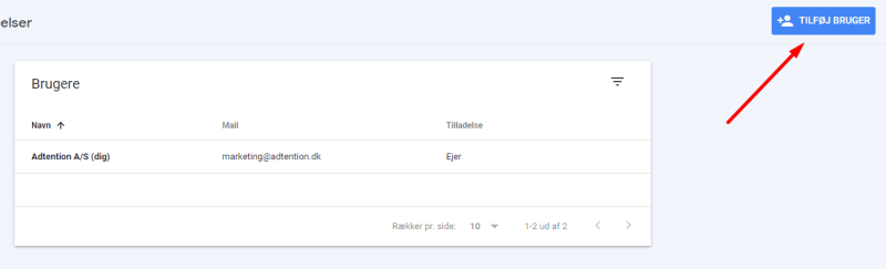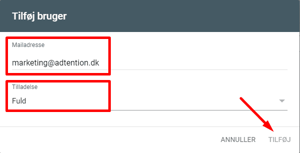 Her skal du angive vores email: marketing@adtention.adtention.dev og som minimum give os fuld adgang til jeres Google Search Console