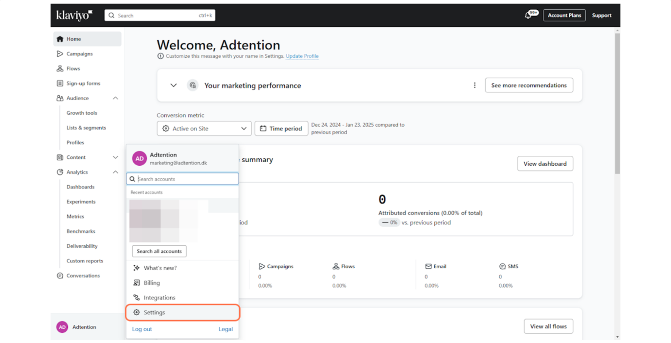 Har du ikke en Klaviyo? Tag fat i din kontaktperson hos Adtention, som kan oprette en for dig.
