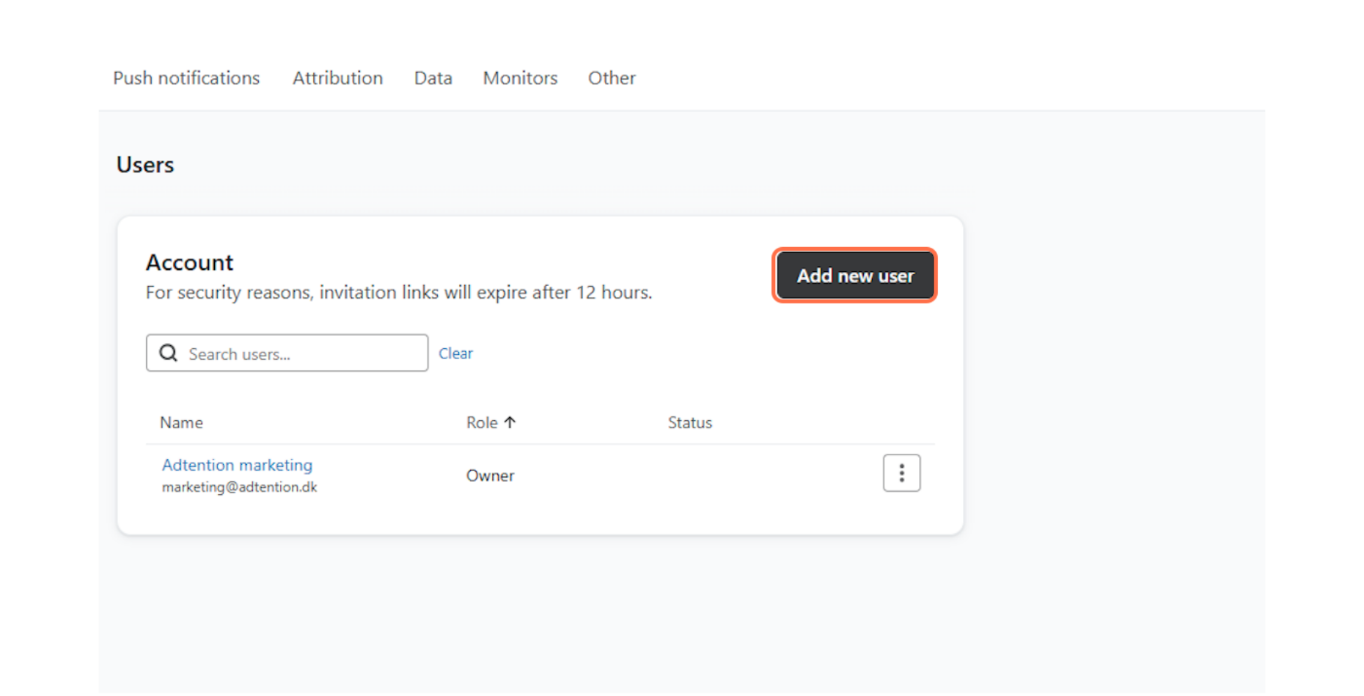 Her kan du se alle de adgange, du har givet til din konto. I højre side skal du trykke på “Add New User”, som vist nedenfor.