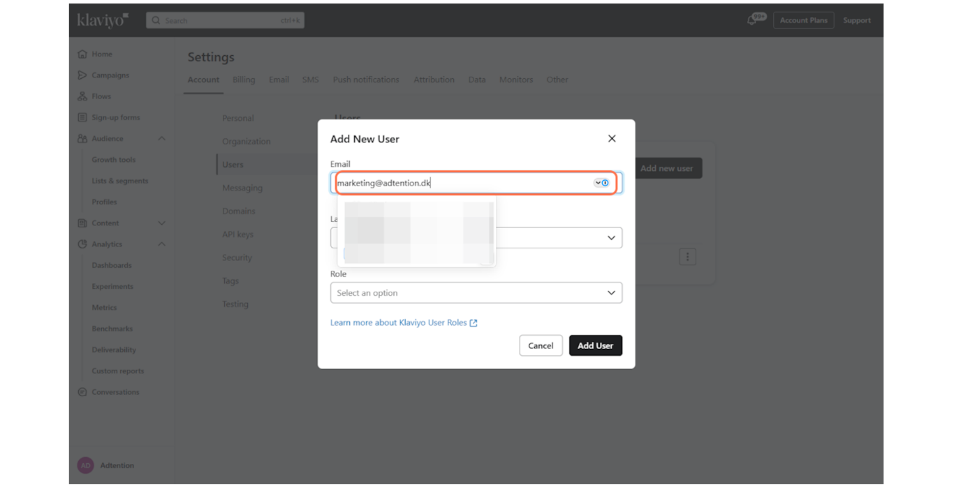 En pop-up menu kommer nu frem. Indtast Email adressen: marketing@adtention.adtention.dev
