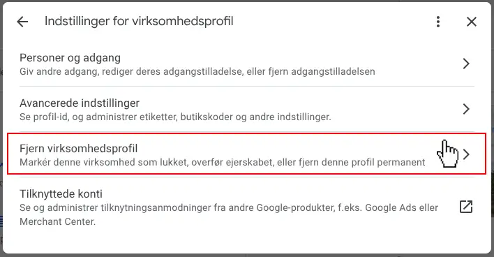 Step 4: I indstillingsmenuen skal du vælge “Fjern virksomhedsprofil”. Dette vil slette din Google My Business-konto, og din virksomhed vil ikke længere være synlig på Google.