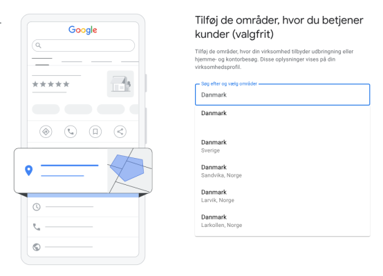 Herefter skal du angive, hvilket område du servicerer. Hvis din virksomhed ikke har en fysisk butik, men tilbyder tjenester i et specifikt område, skal du definere dit serviceområde. Du kan vælge byer, postnumre eller regioner, hvor du tilbyder dine tjenester, så kunder i disse områder kan finde din virksomhed.