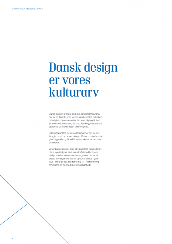 Badeværelset er dit personlige frirum, hvor du kan sætte dit eget præg og skabe et sted, hvor du og alle andre, der bruger det, får en oplevelse af ro og velvære. Det er præcist dét, Dansanis nye kommunikationskoncept handler om. Samtidigt skal det også være en levende og inspirerene oplevelse at planlægge dit eget badeværelse. Det sætter sætningen “Create your personal space” rammerne for. Her starter en spændende historie, der både involverer og opfordrer forbrugeren til at bruge Dansani til at skabe noget helt særligt.