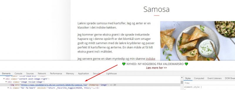 Du kan tjekke et billedes titel ved at højreklikke, åbne det i en ny fane og se, hvad der står i adressefeltet. På denne opskrift på sprøde samosas, er filnavnet også samosa.