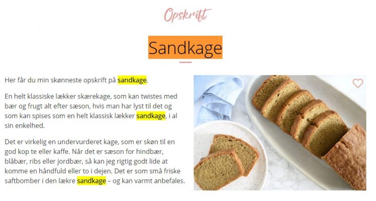 Af Valdemarsro kan du altså lære, hvordan du får dine søgeord til at indgå så naturligt som muligt. Ann-Christine skriver ikke overdrevet sælgende, men maler derimod et inspirerede billede af, hvilke muligheder man har med en sandkage. Hun giver også nogle personlige anbefalinger til, hvordan man som læser får mest muligt ud af opskriften afhængigt af sæsonen.
