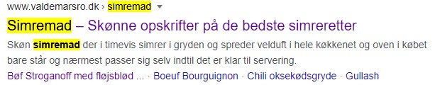Her bruges både det primære søgeord, ‘simremad’ og det relaterede søgeord, ‘simreretter’. To fluer med ét smæk, hvor Valdemarsro fortæller bloggen, hvad kategorien omhandler. Derudover bruger Ann-Christine også en visuel opdeling af kategoriens emne, ‘simremad’ og payoff med at klikke på hendes resultat, nemlig ‘skønne opskrifter på de bedste simreretter’. Bloggens indehaver vælger at visualisere opdelingen med en bindestreg, men du kan også vælge at bruge specialtegn som eksempelvis en pil.