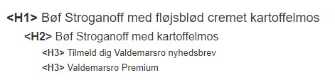 Som du kan se i eksemplet fra Valdemarsro, sørger Ann-Christine også for at bruge sit primære søgeord, ‘bøf stroganoff’, i både H1 og H2. Du kan også sagtens bruge søgeordet i en bredere kontekst, f. eks ‘opskrift på bøf stroganoff’ og ‘sådan laver du den bedste bøf stroganoff’.