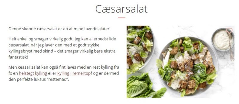 Valdemarsro linker f. eks. videre til andre opskrifter, der minder om den, du læser her og nu. Hvis du nu havde i sinde at lave en sprød cæsarsalat, kommer Ann-Christine også med eksempler på, hvad du ellers kan bruge kylling til. Hun linker internt til to andre opskrifter på hendes side, nemlig helstegt kylling og kylling i rømertopf: