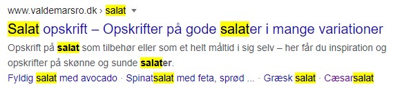 Der er flere gode eksempler, for Valdemarsro er ret konsekvente med både gode metainformationer, meningsfuld brug af søgeord og en god sidestruktur, der resulterer i disse sitelinks. Se nu bare, hvad der sker, når man søger på ‘salat’ på Google: